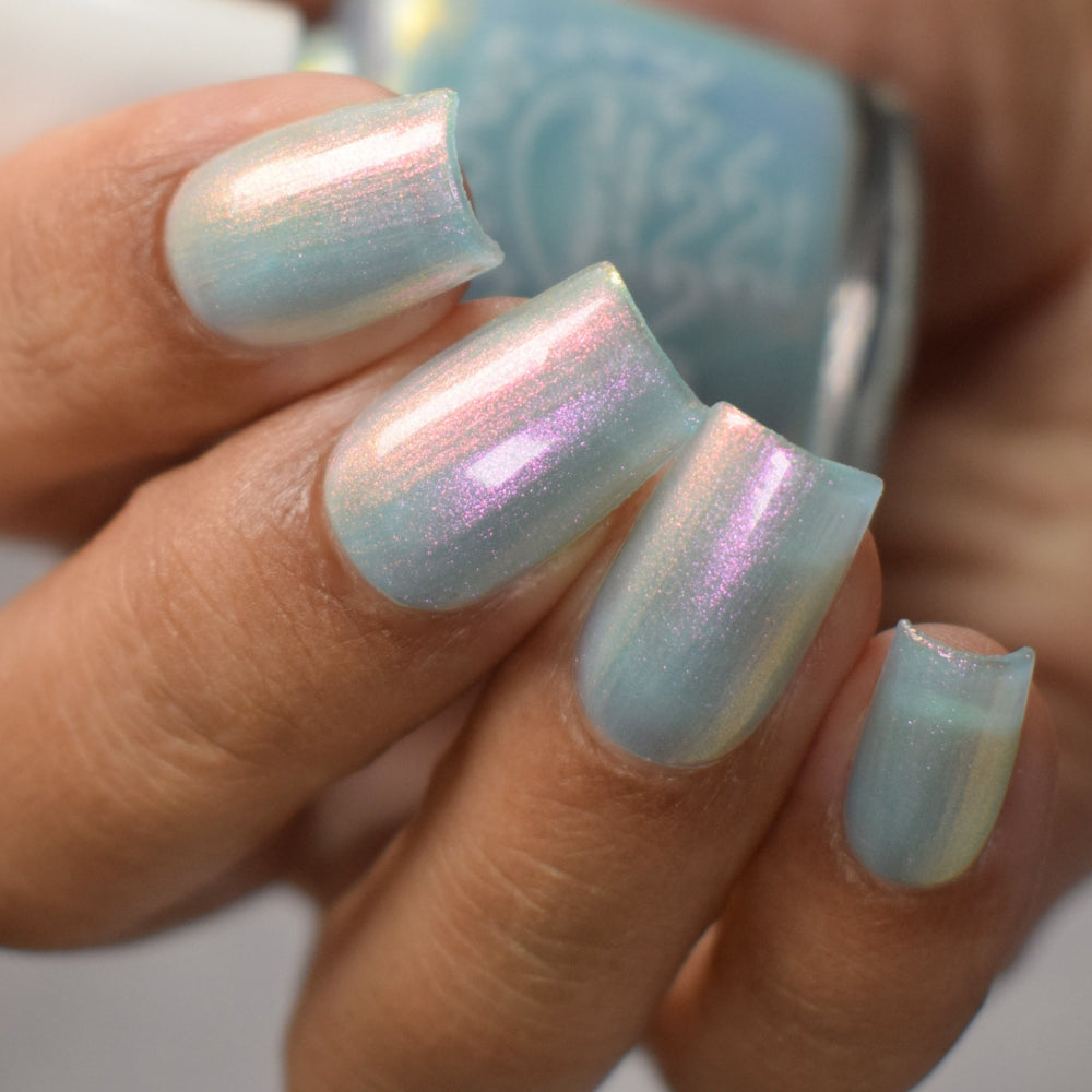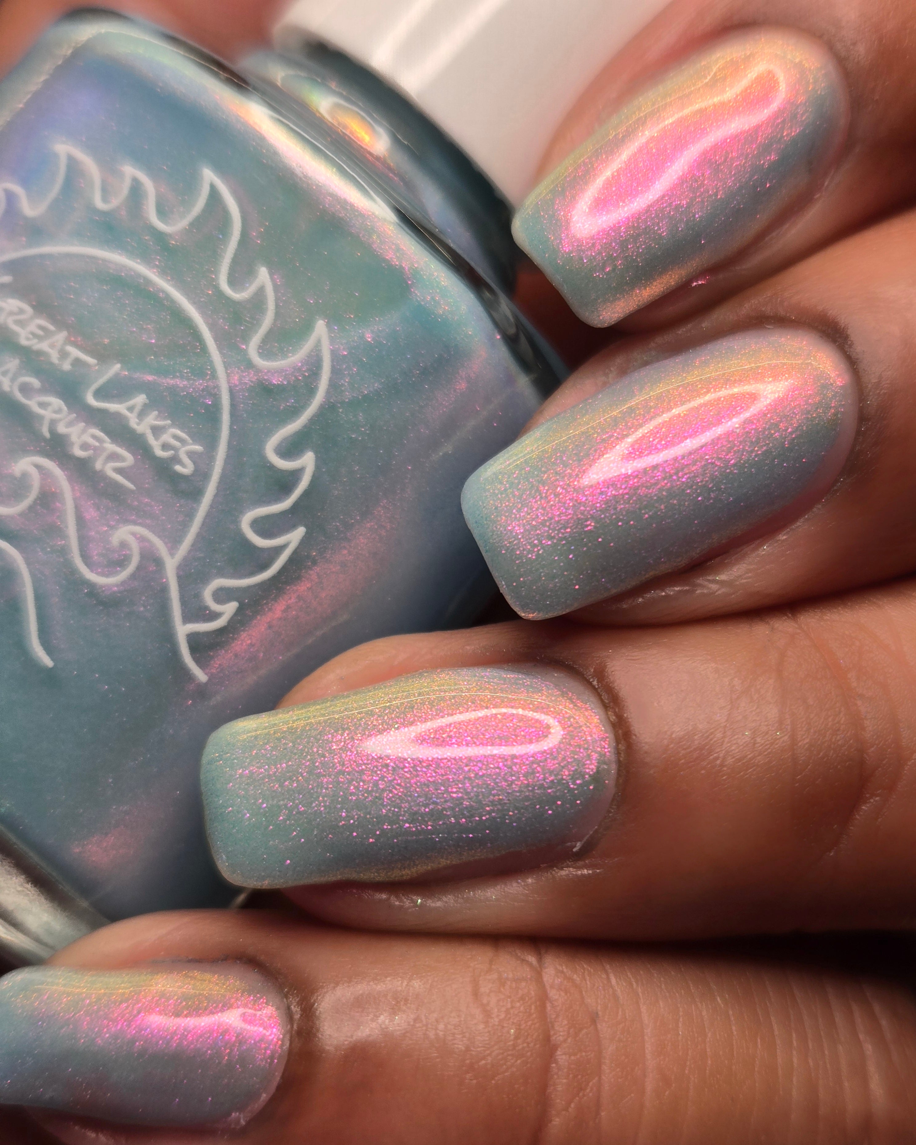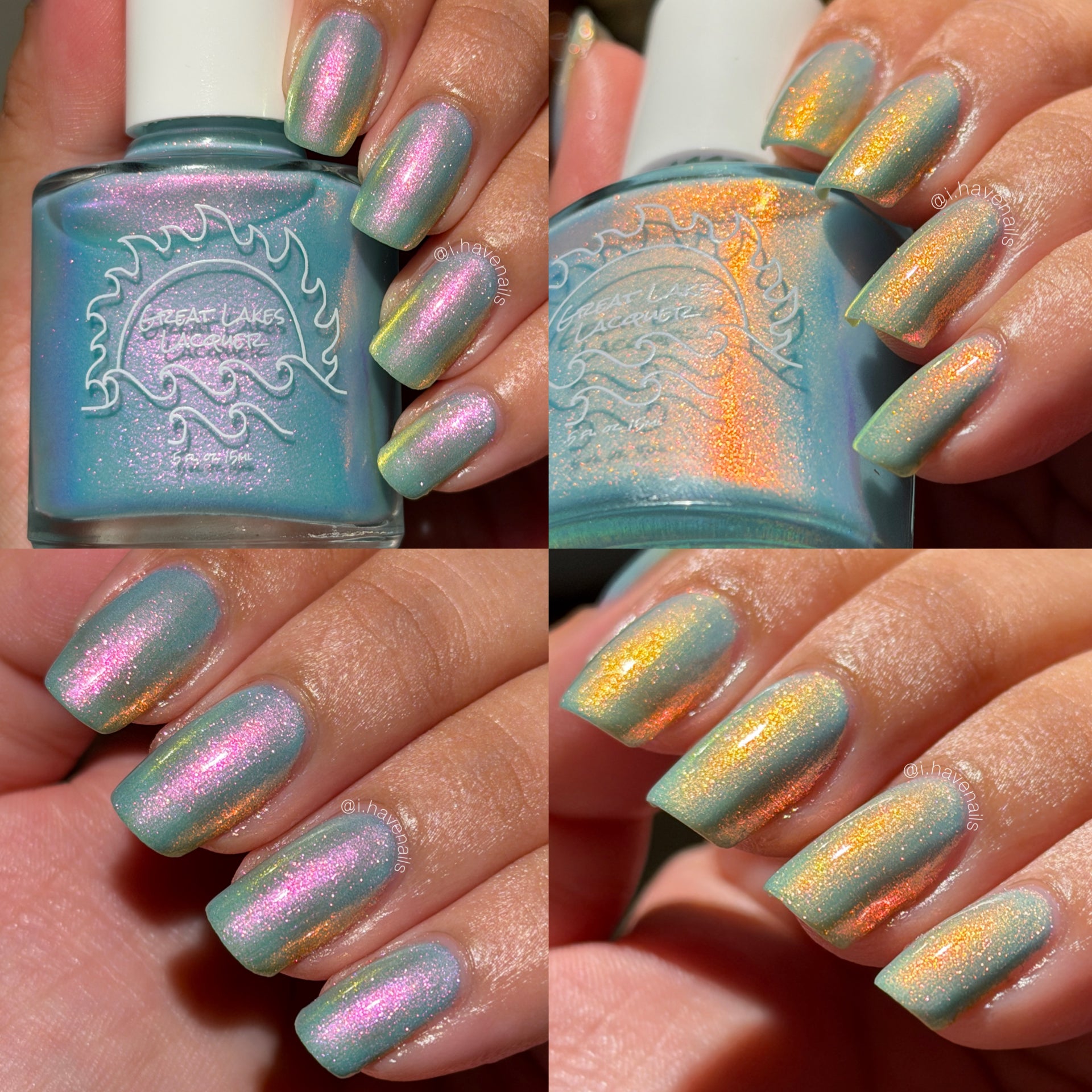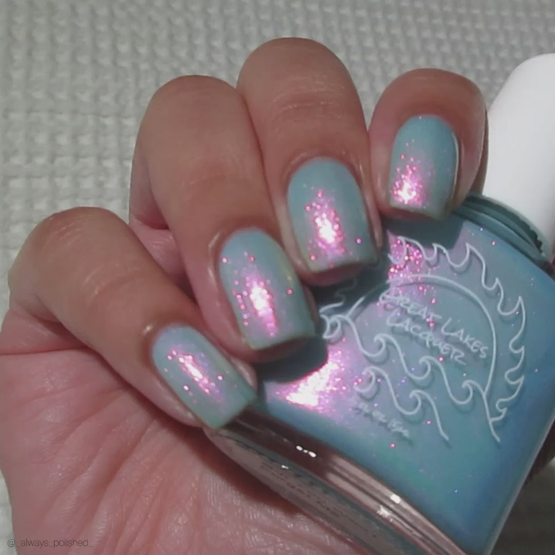 Aqua filled with a pink to orange to gold shifting shimmer.  This is a lighter tone that the OG with a different pink shifting shimmer.