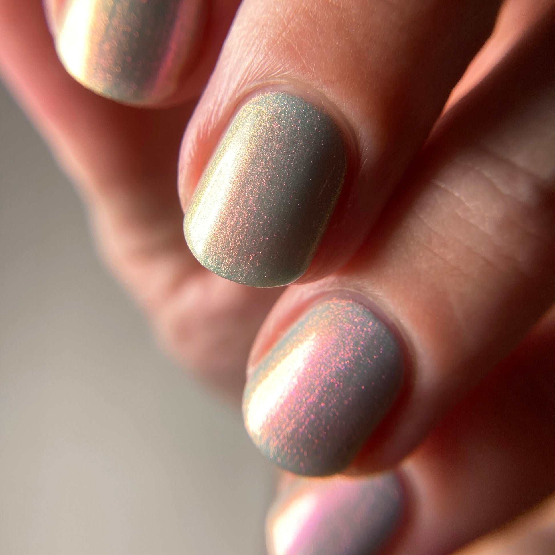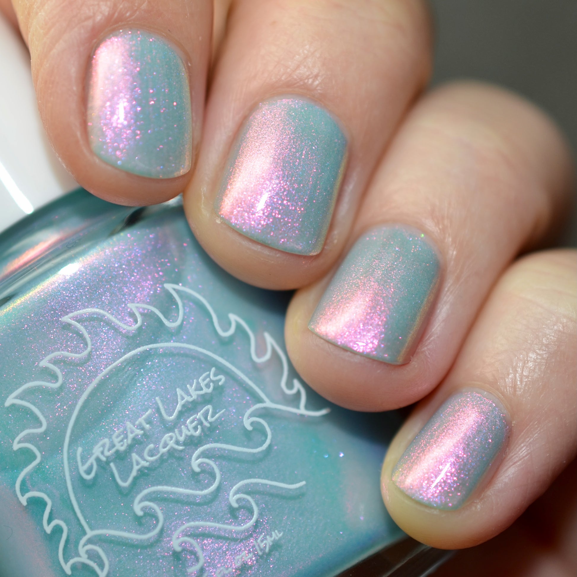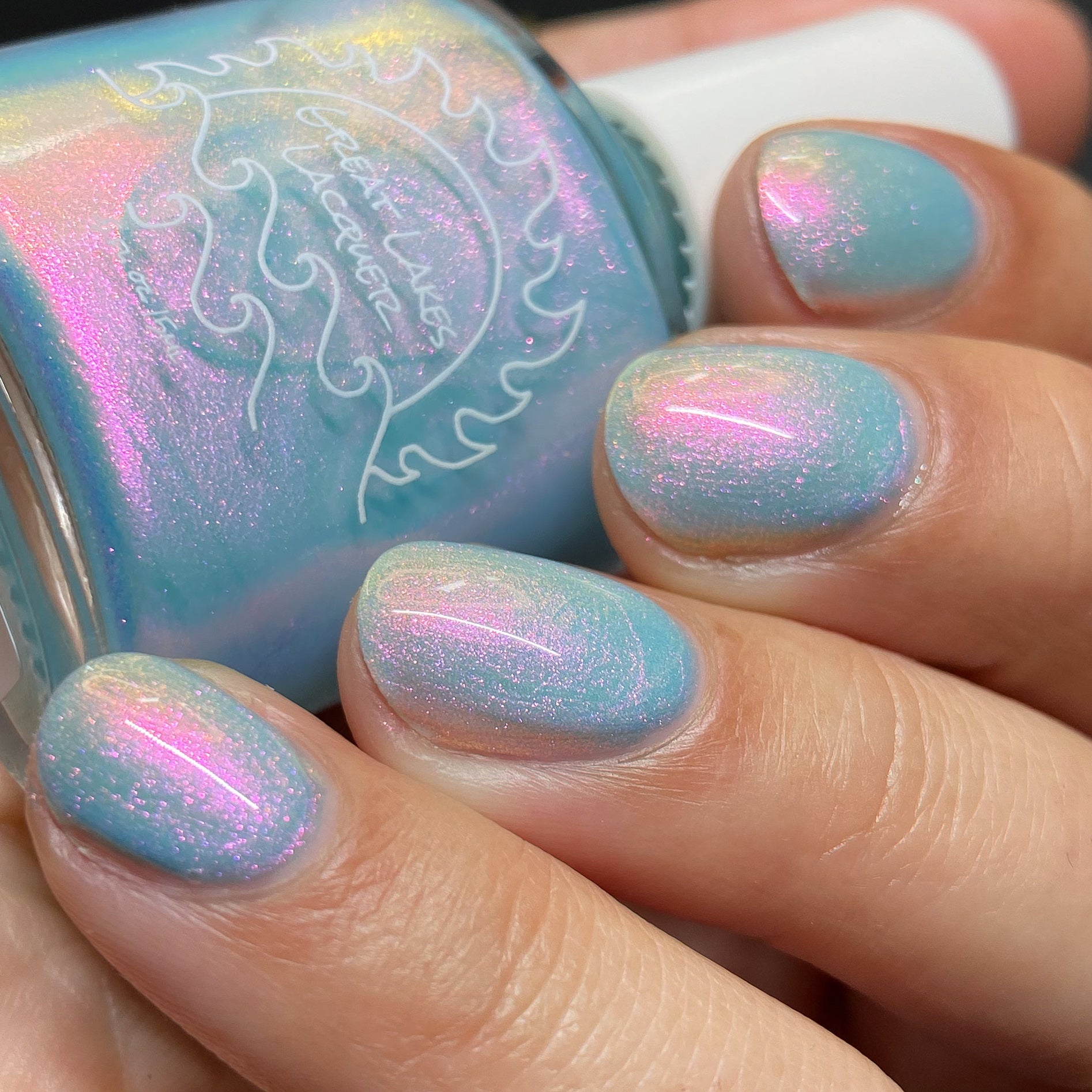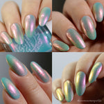 Aqua filled with a pink to orange to gold shifting shimmer.  This is a lighter tone that the OG with a different pink shifting shimmer.