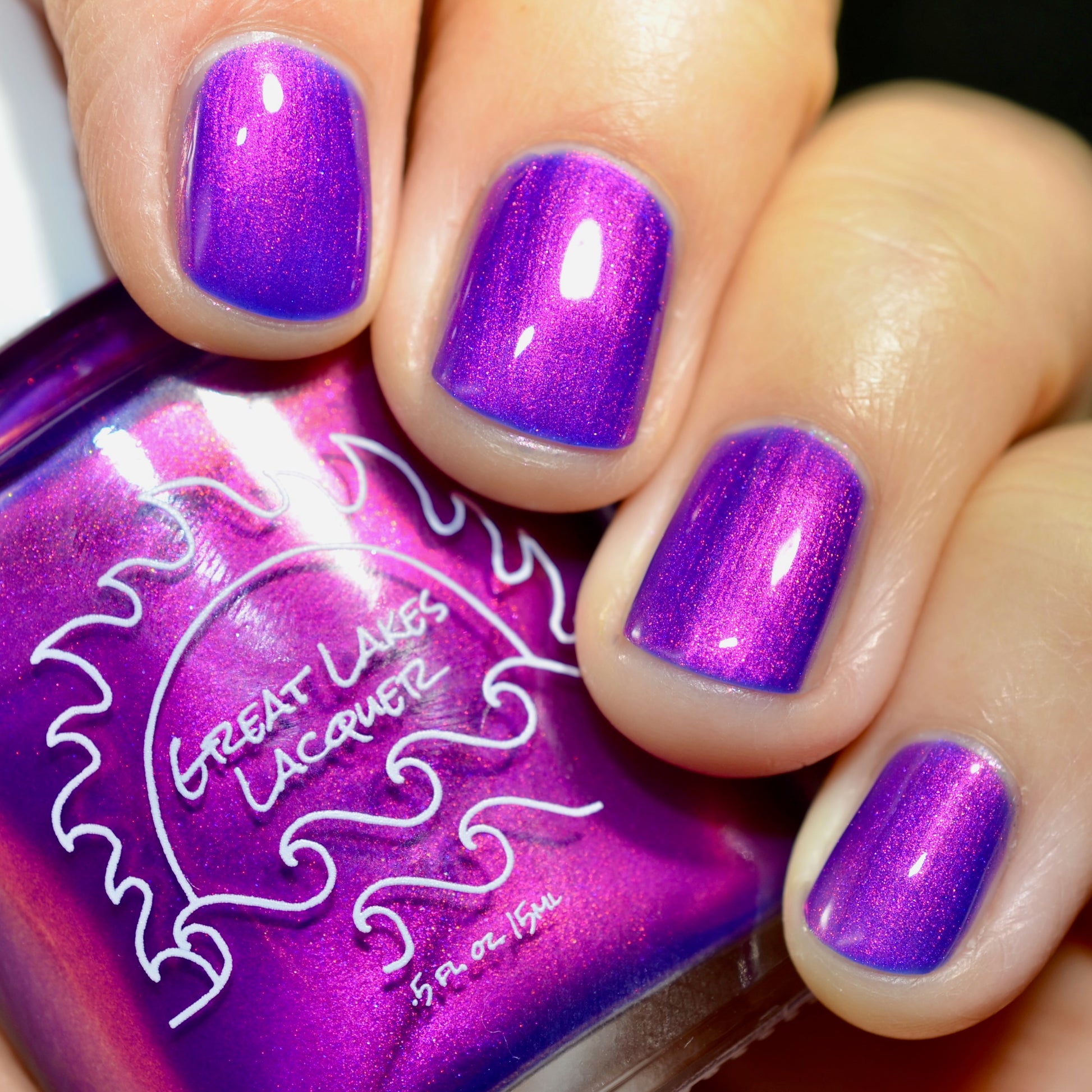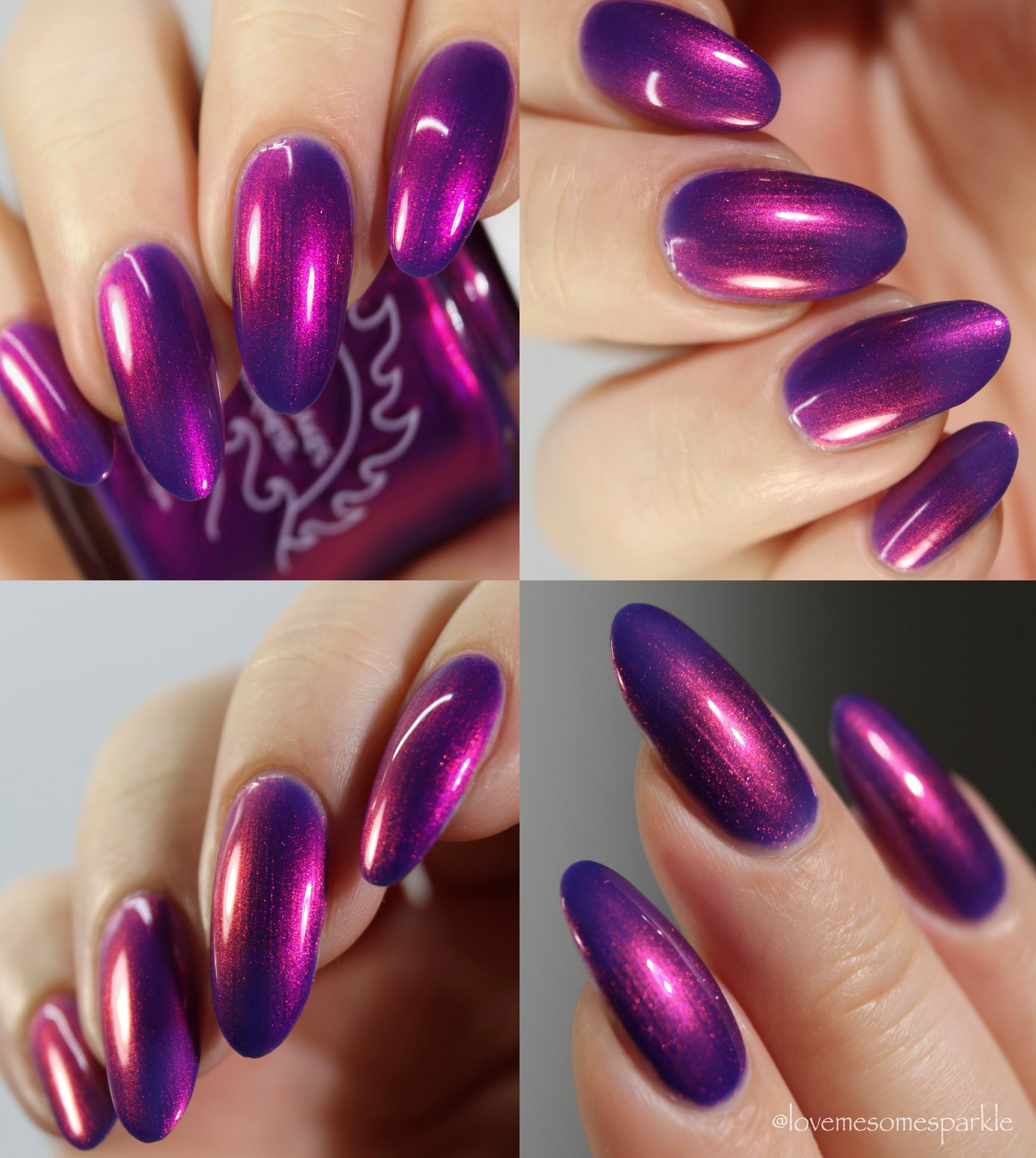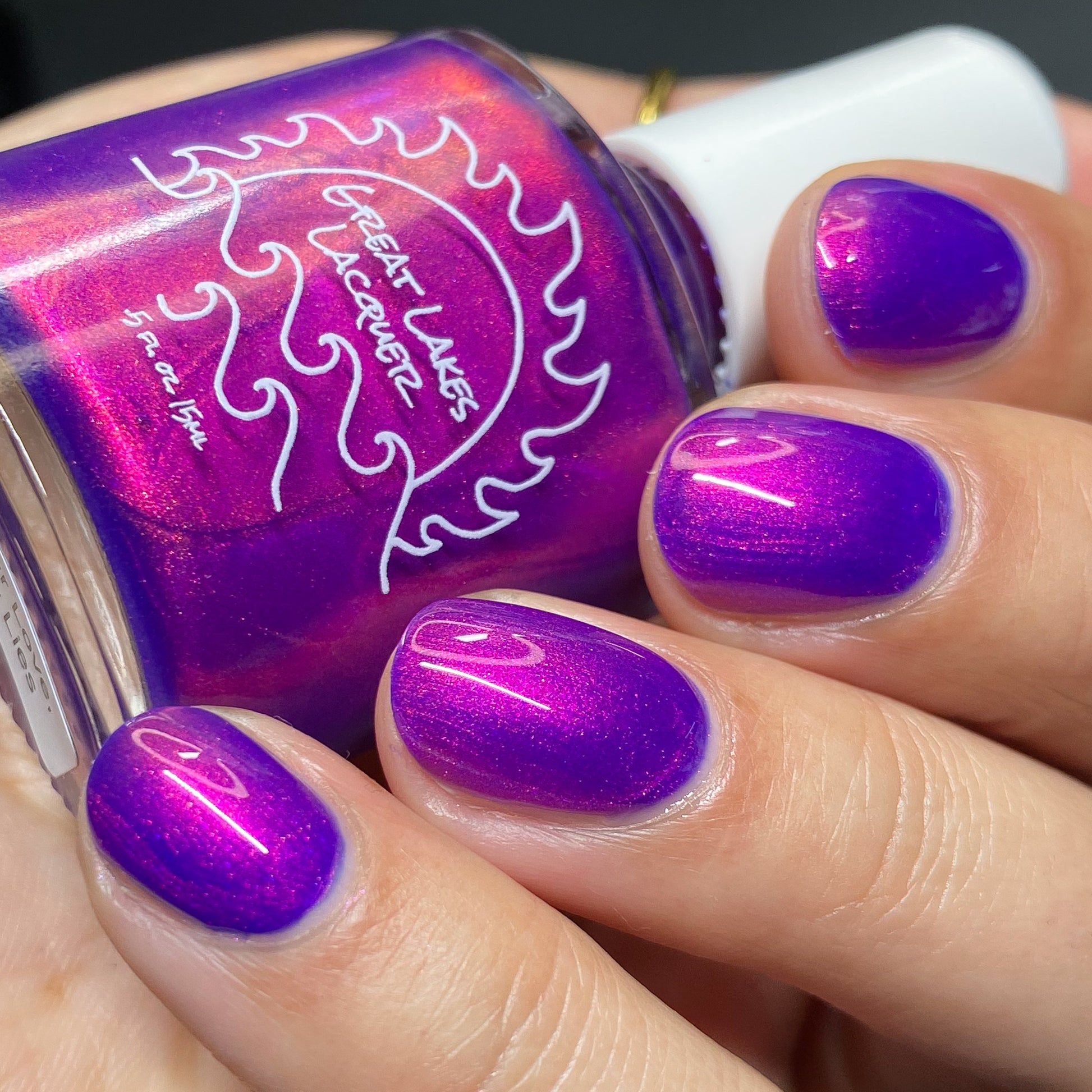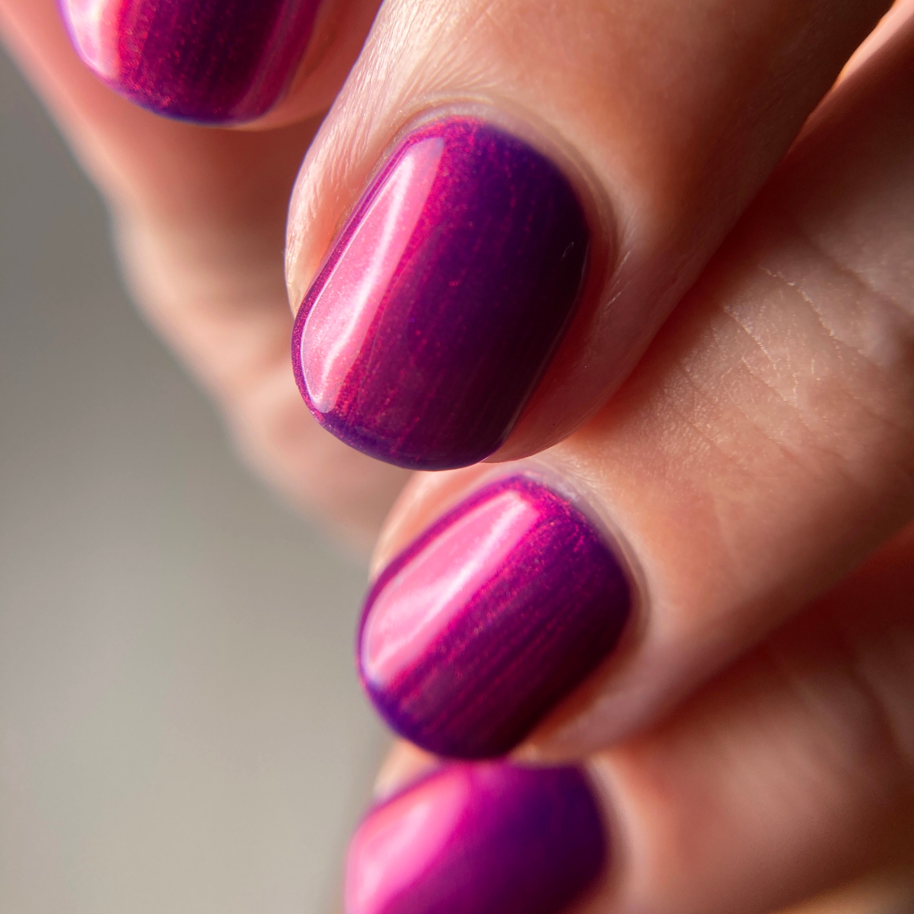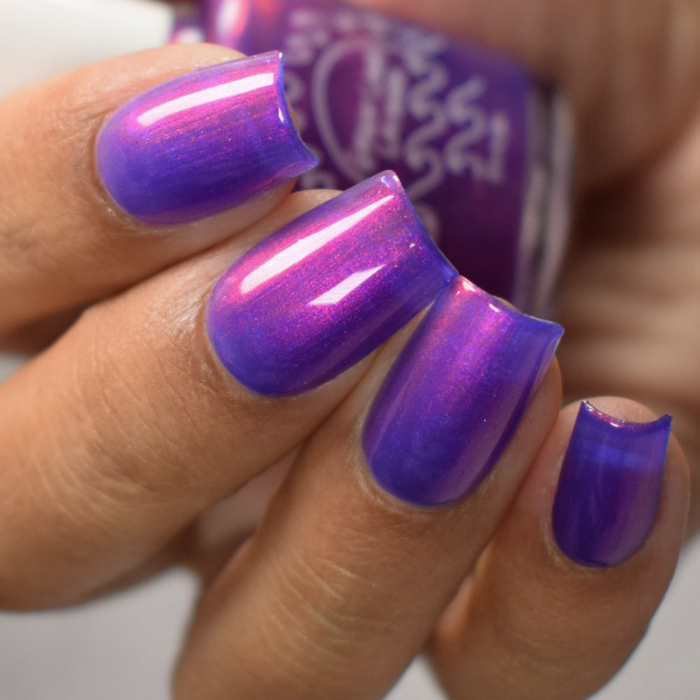 A rich and vivid violet filled with a fine pink to orange shifting shimmer.  This one is a more rich and darker base color than the OG.