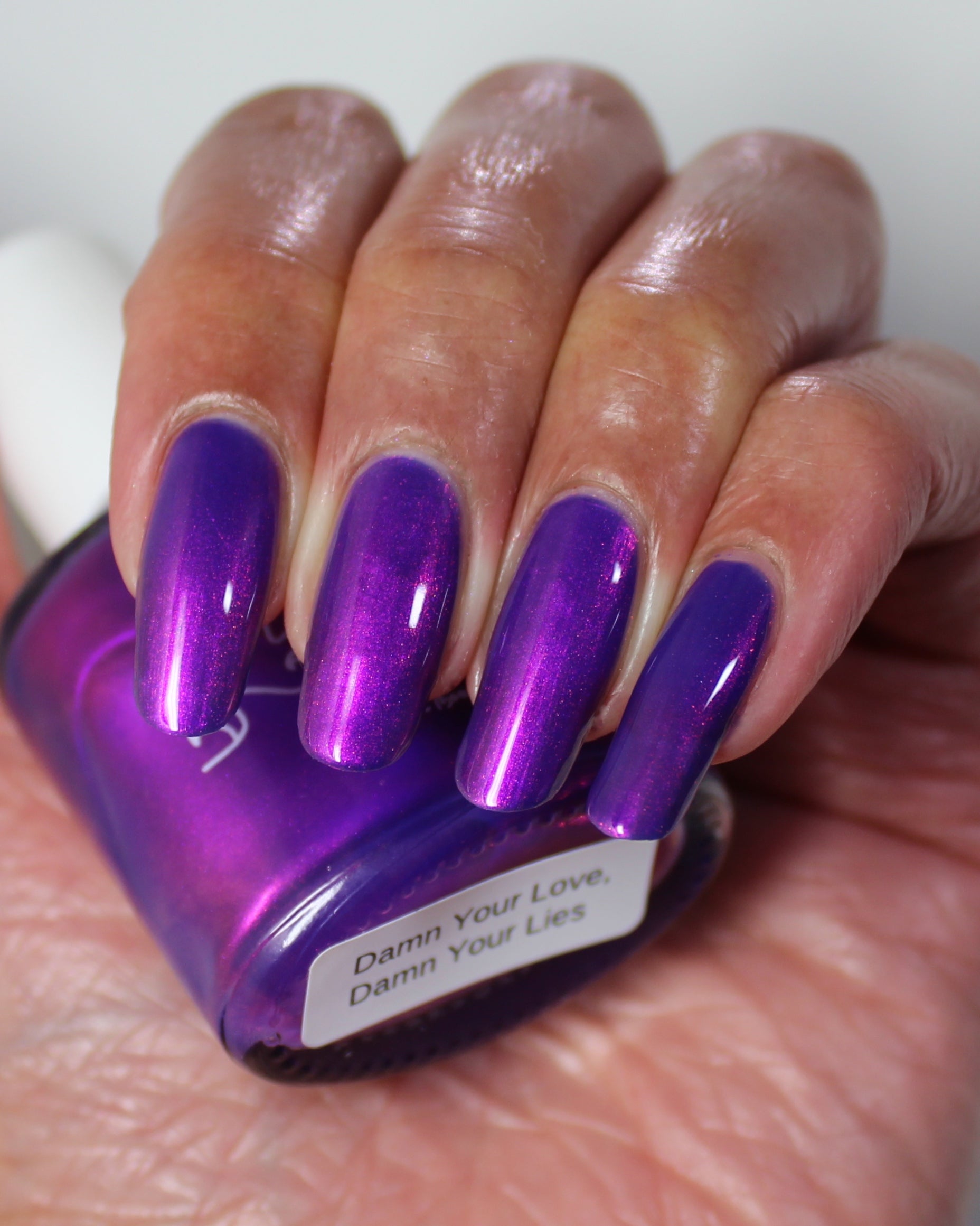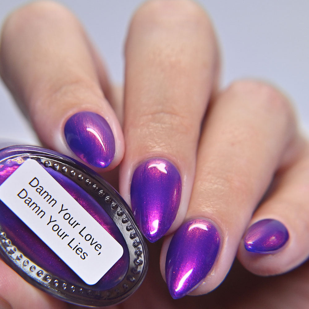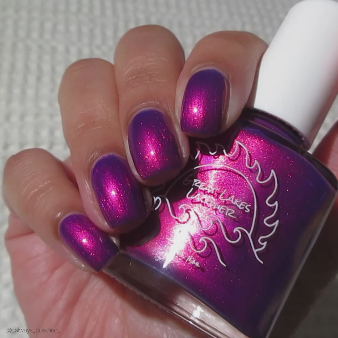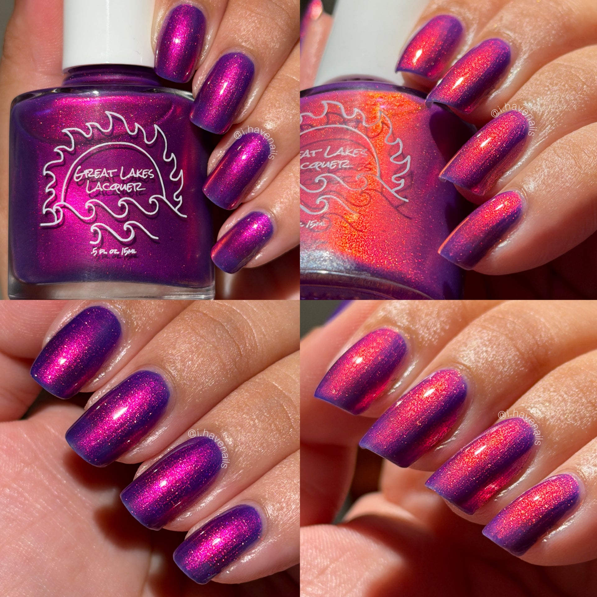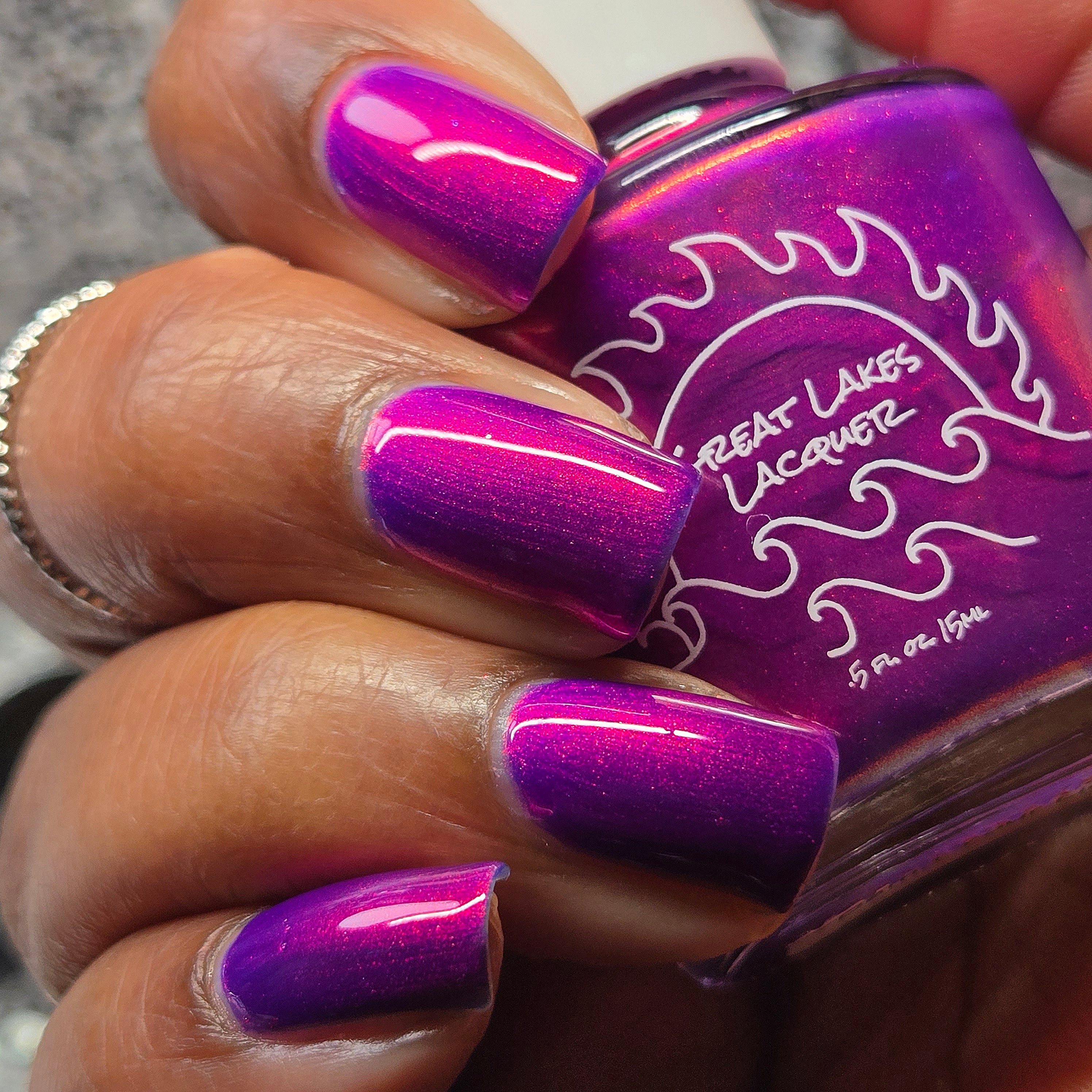 A rich and vivid violet filled with a fine pink to orange shifting shimmer.  This one is a more rich and darker base color than the OG.
