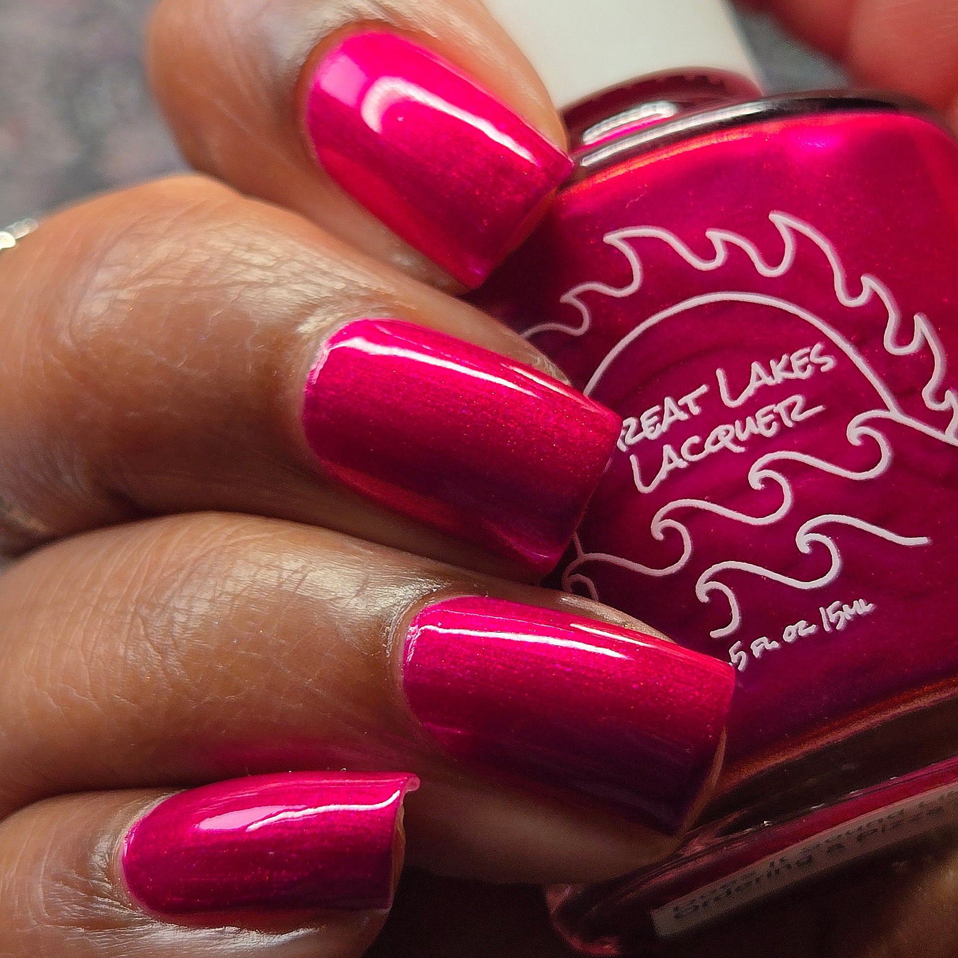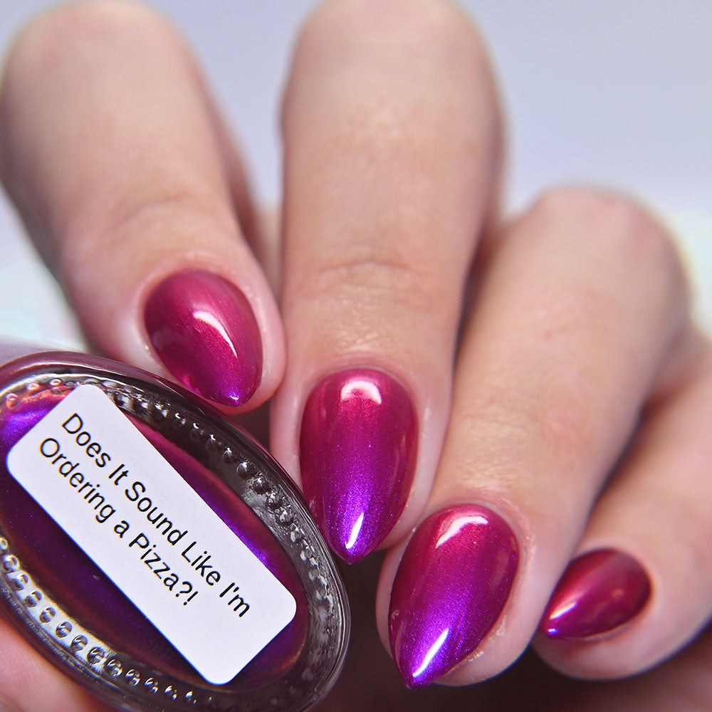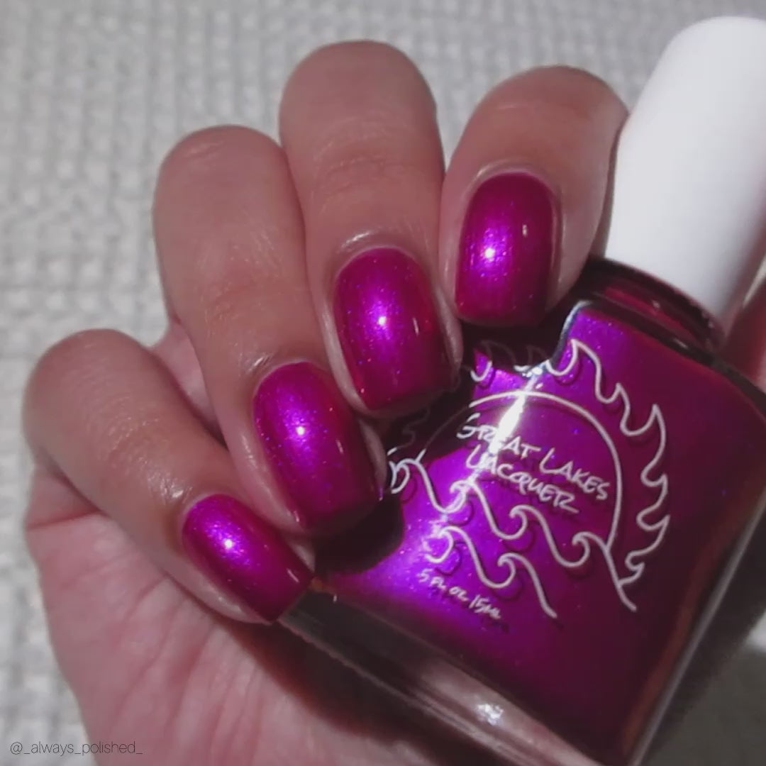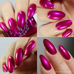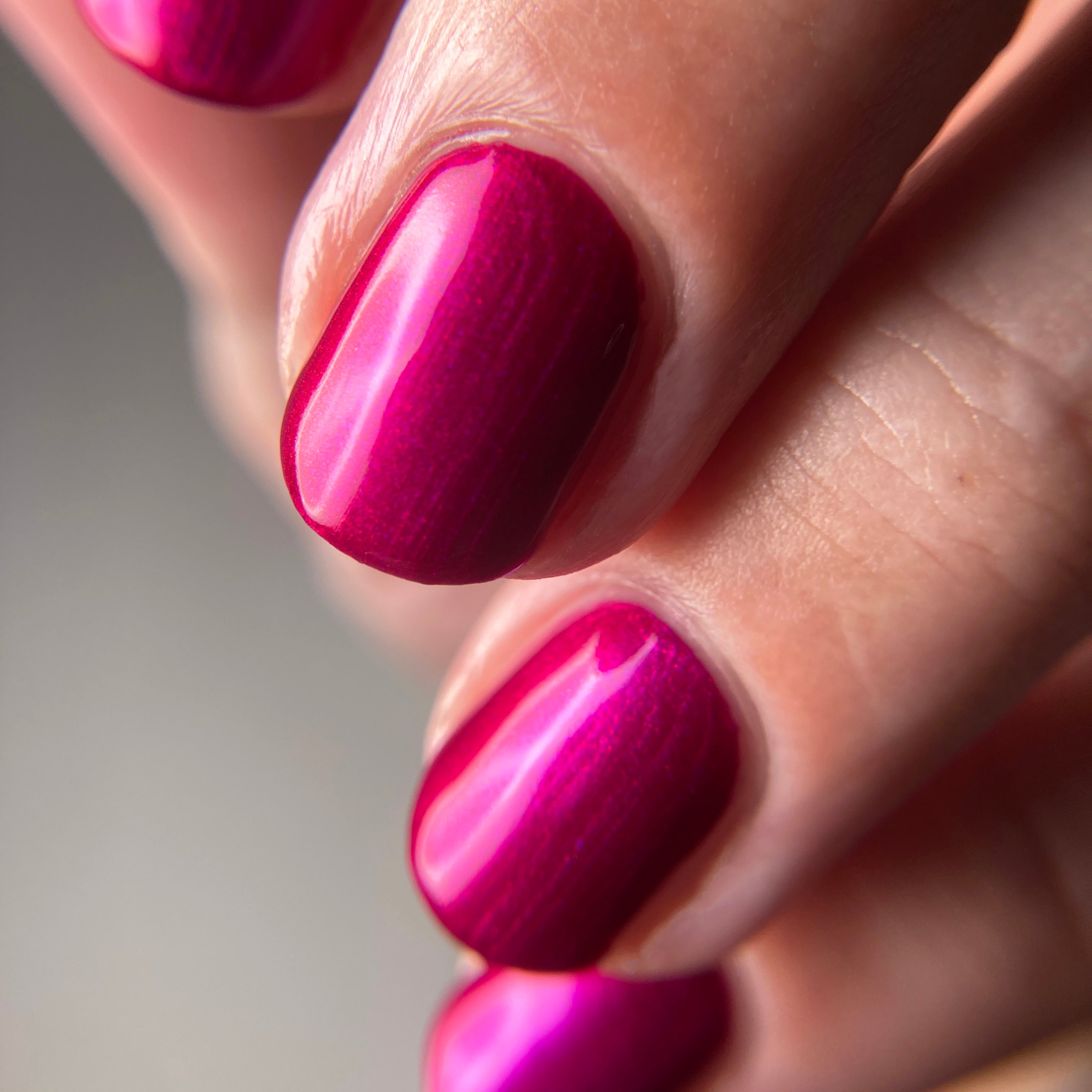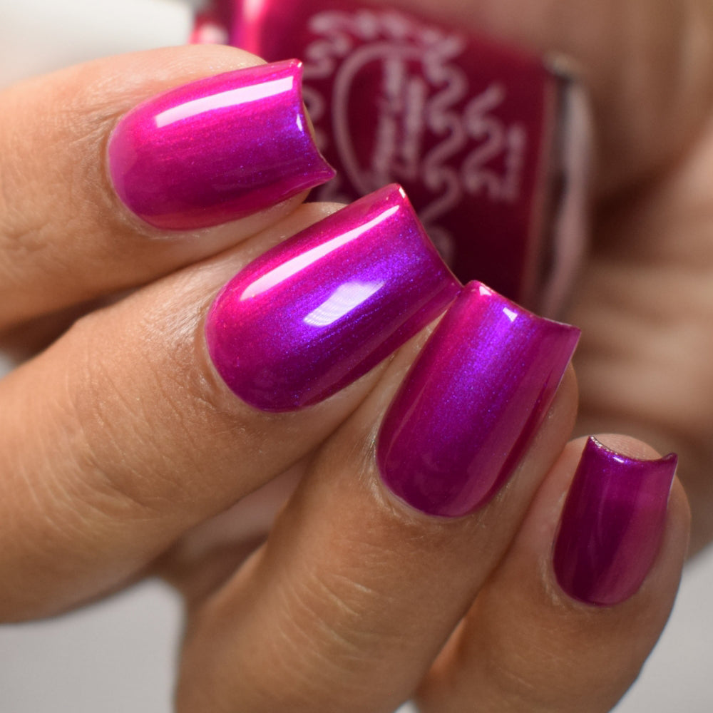 An electric magenta with a purple to pink and red and orange shifting shimmer.