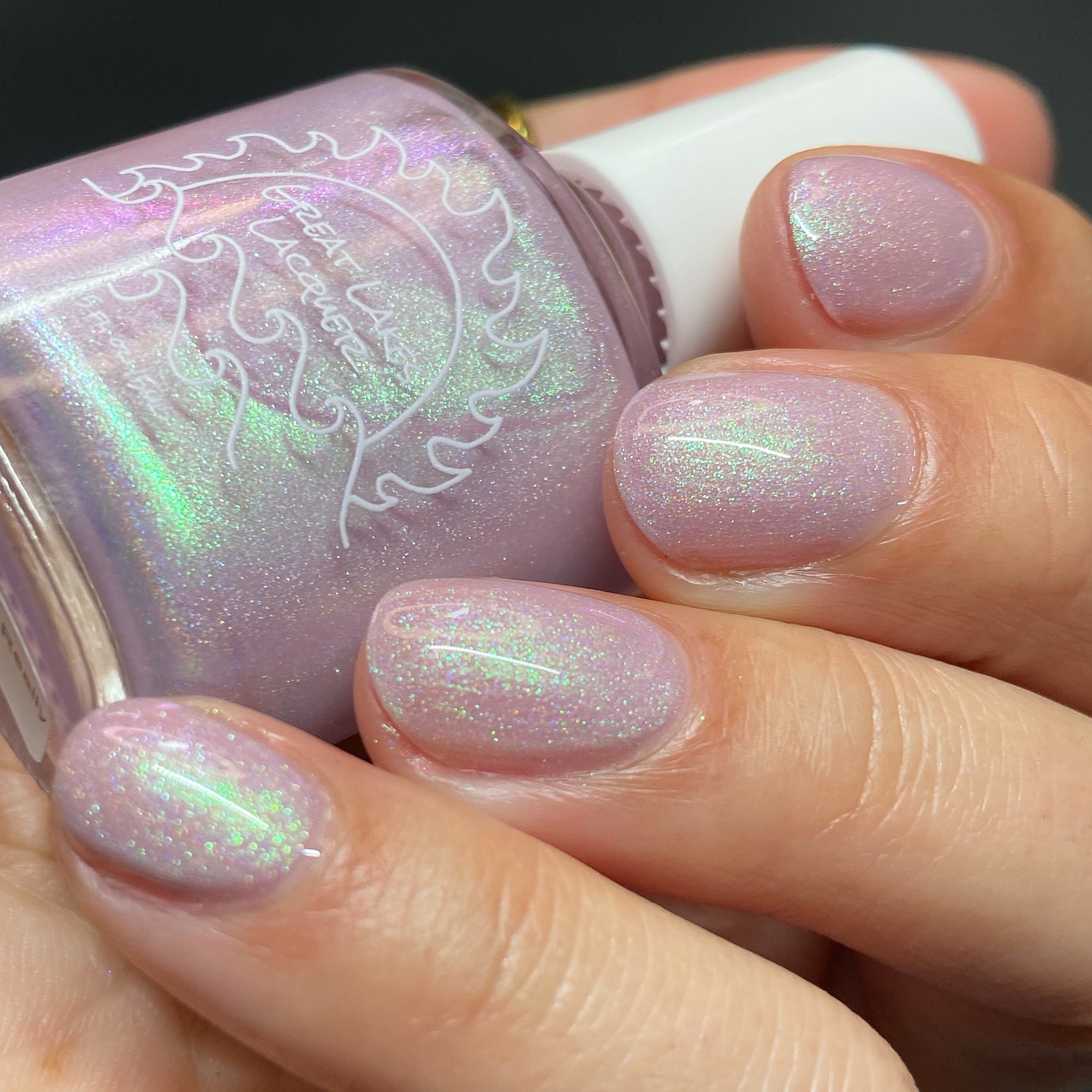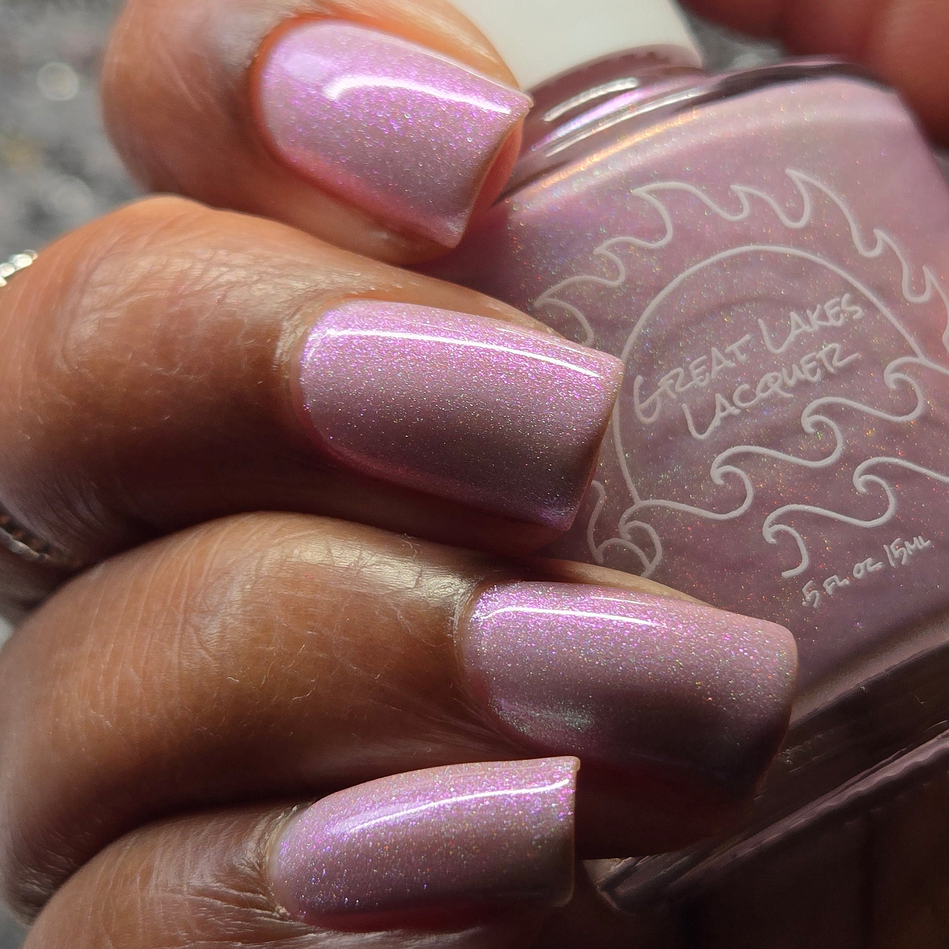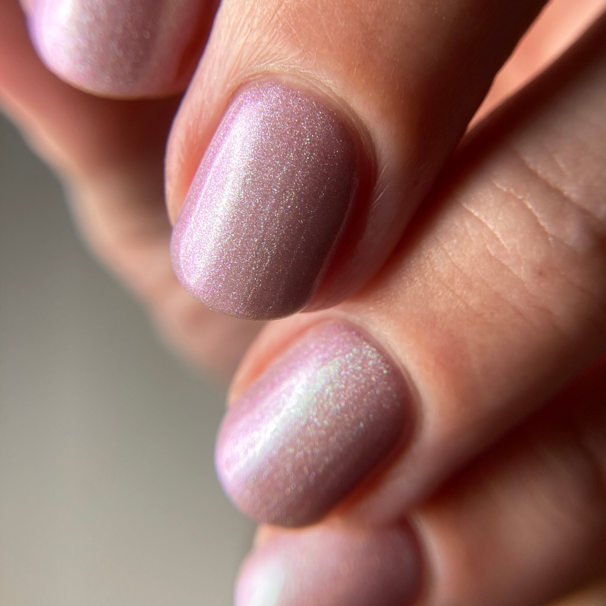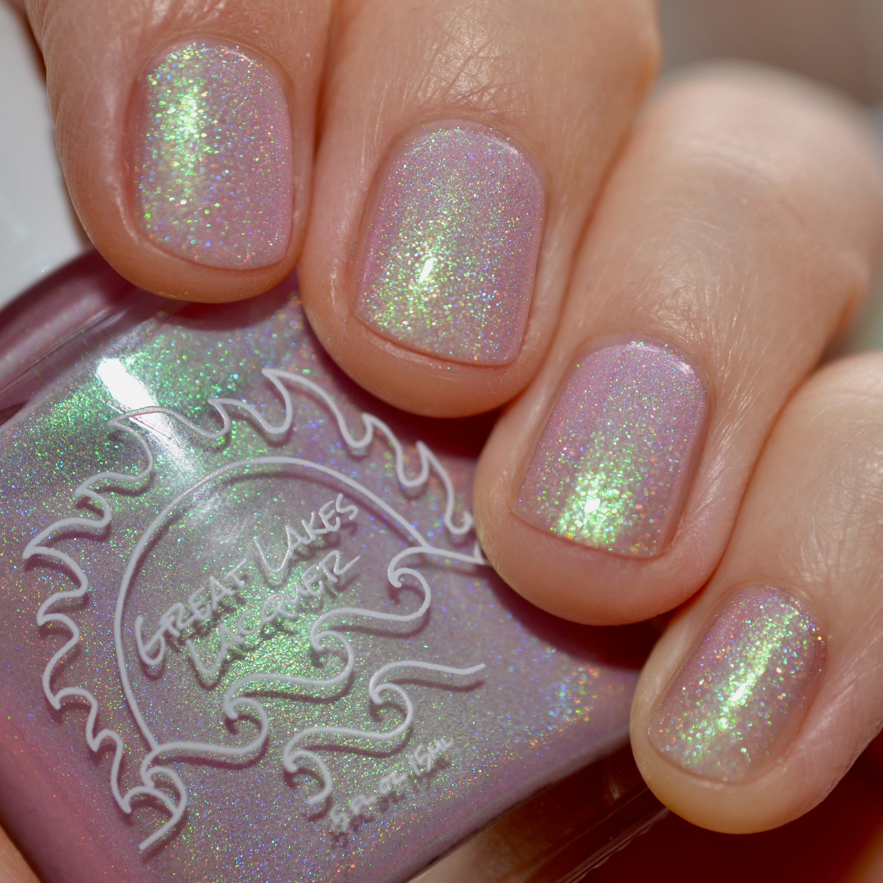A pale orchid pink linear holographic filled with a green to silver to fuschia shifting shimmer.  This one is pretty close to the original although the base color may be slightly different and the shimmer is just a bit different.