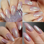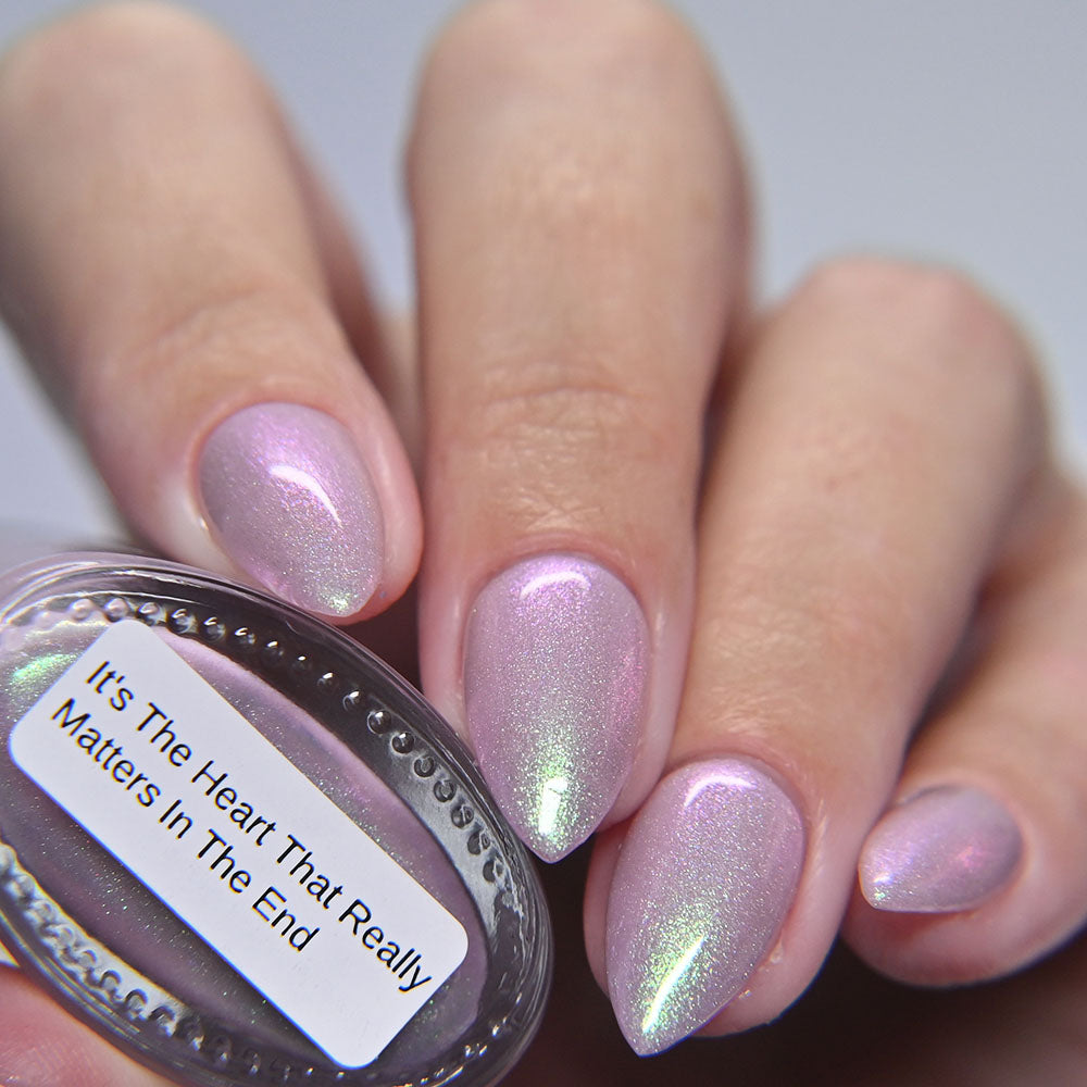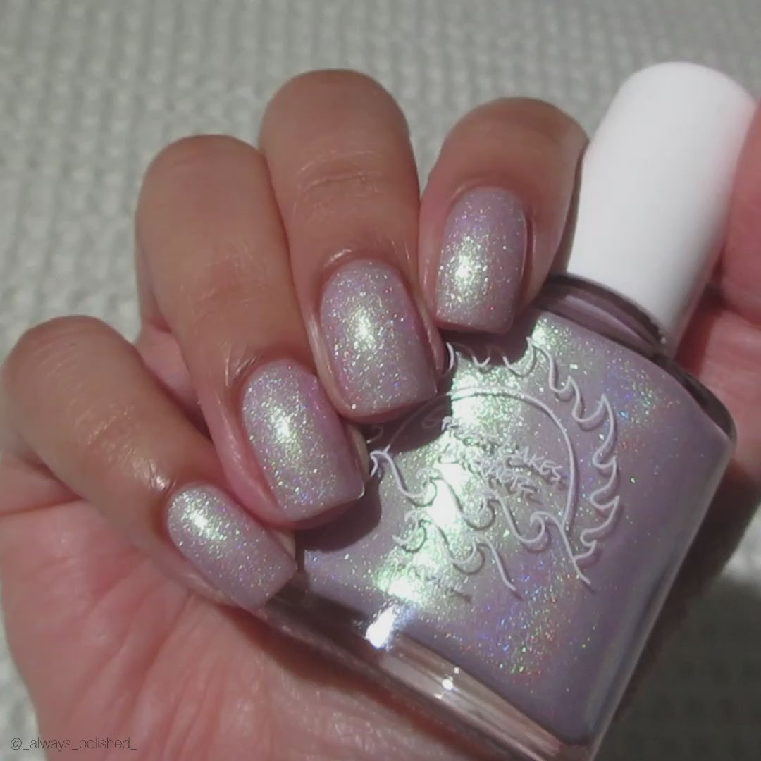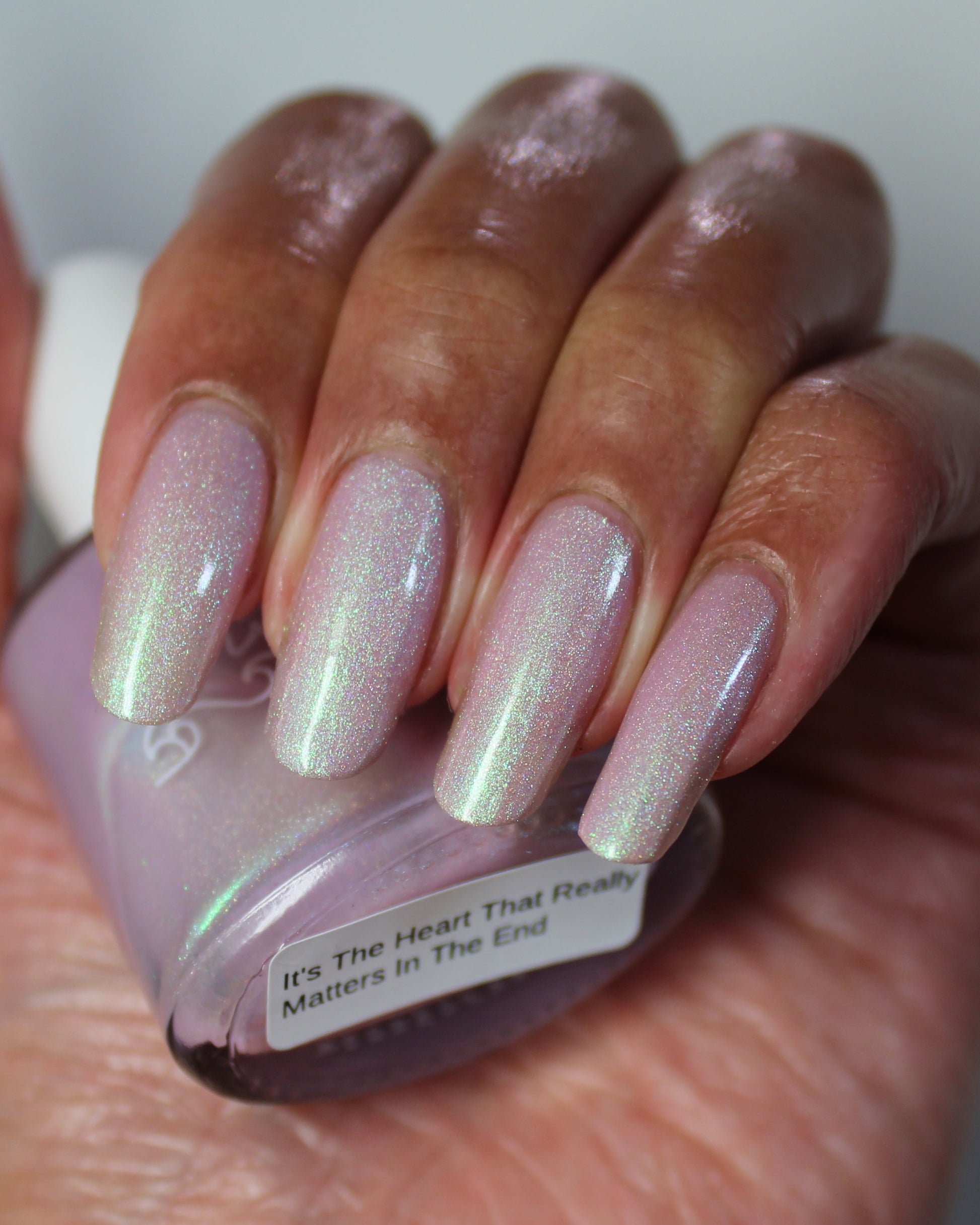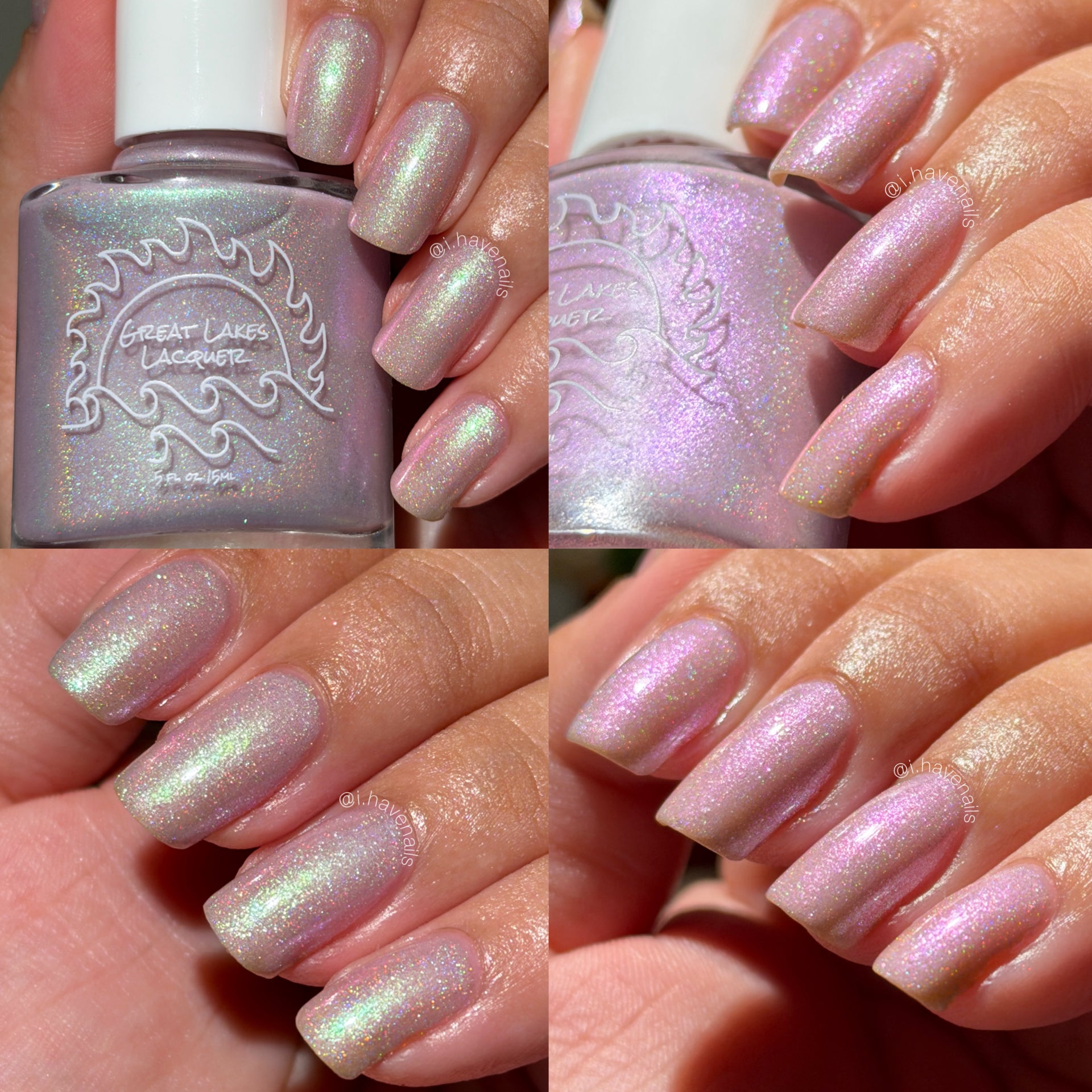 A pale orchid pink linear holographic filled with a green to silver to fuschia shifting shimmer.  This one is pretty close to the original although the base color may be slightly different and the shimmer is just a bit different.