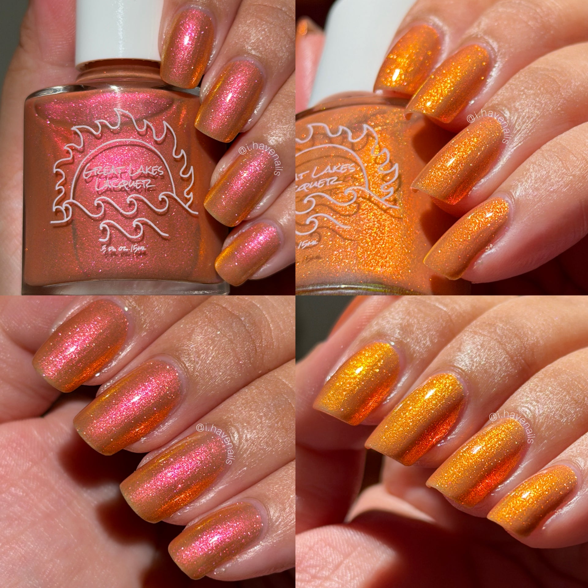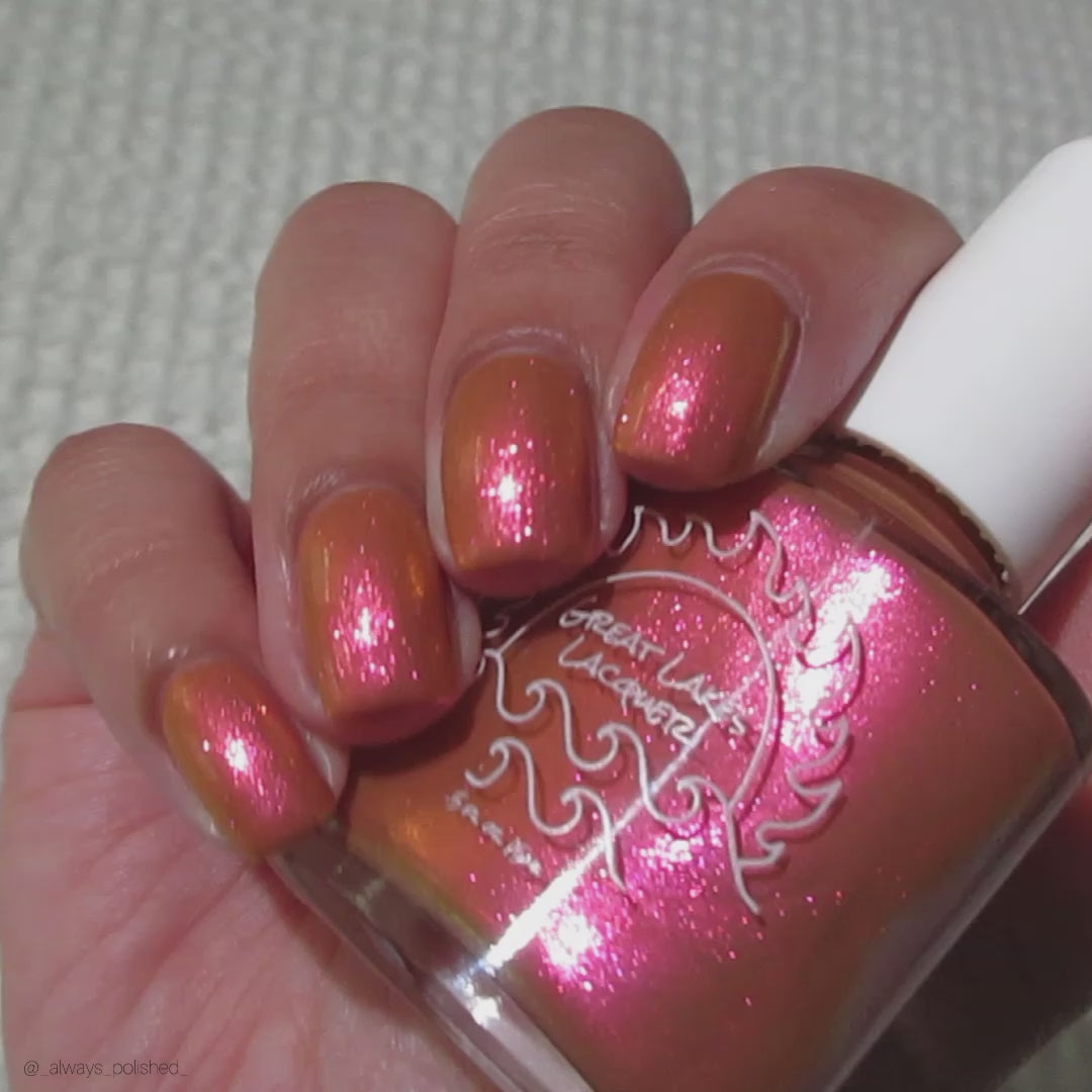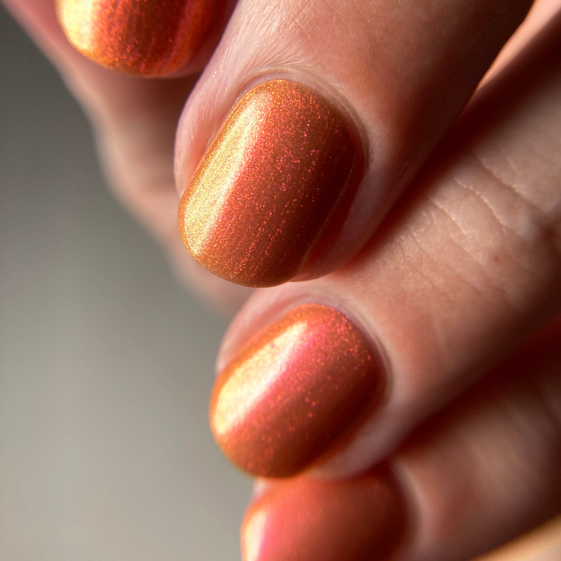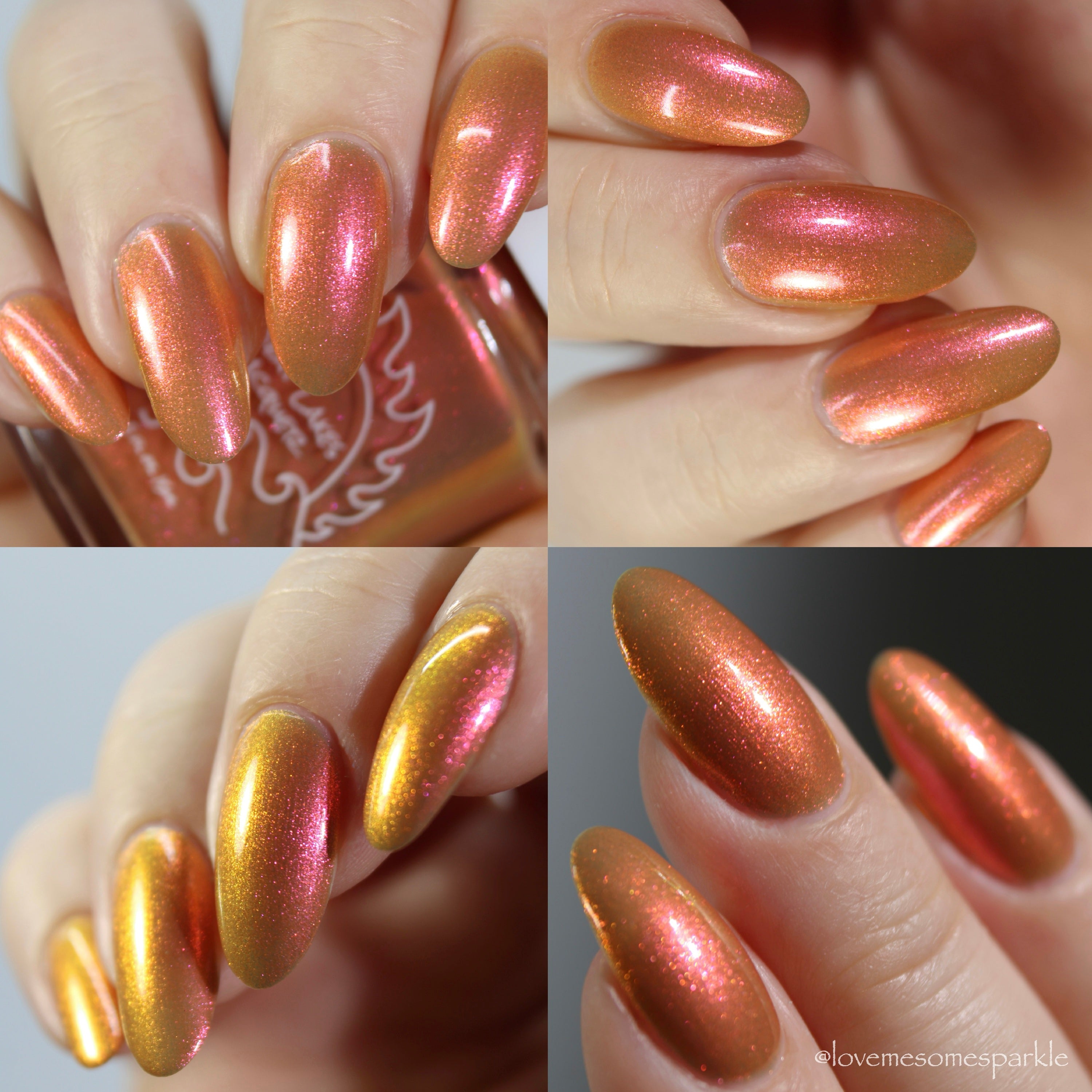 A bronzy sand with a peachy undertone filled with a pink to orange to gold shifting shimmer. This one has a very similar but different base color (more sand than light tan if that matters) and is a bit more opaque.