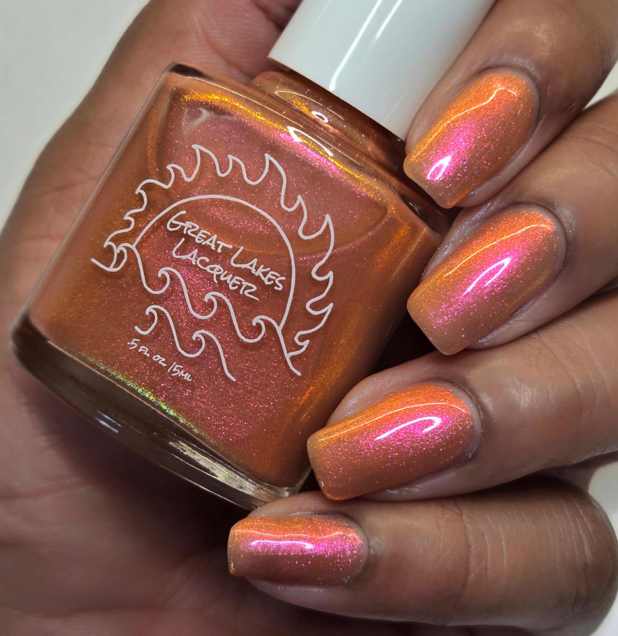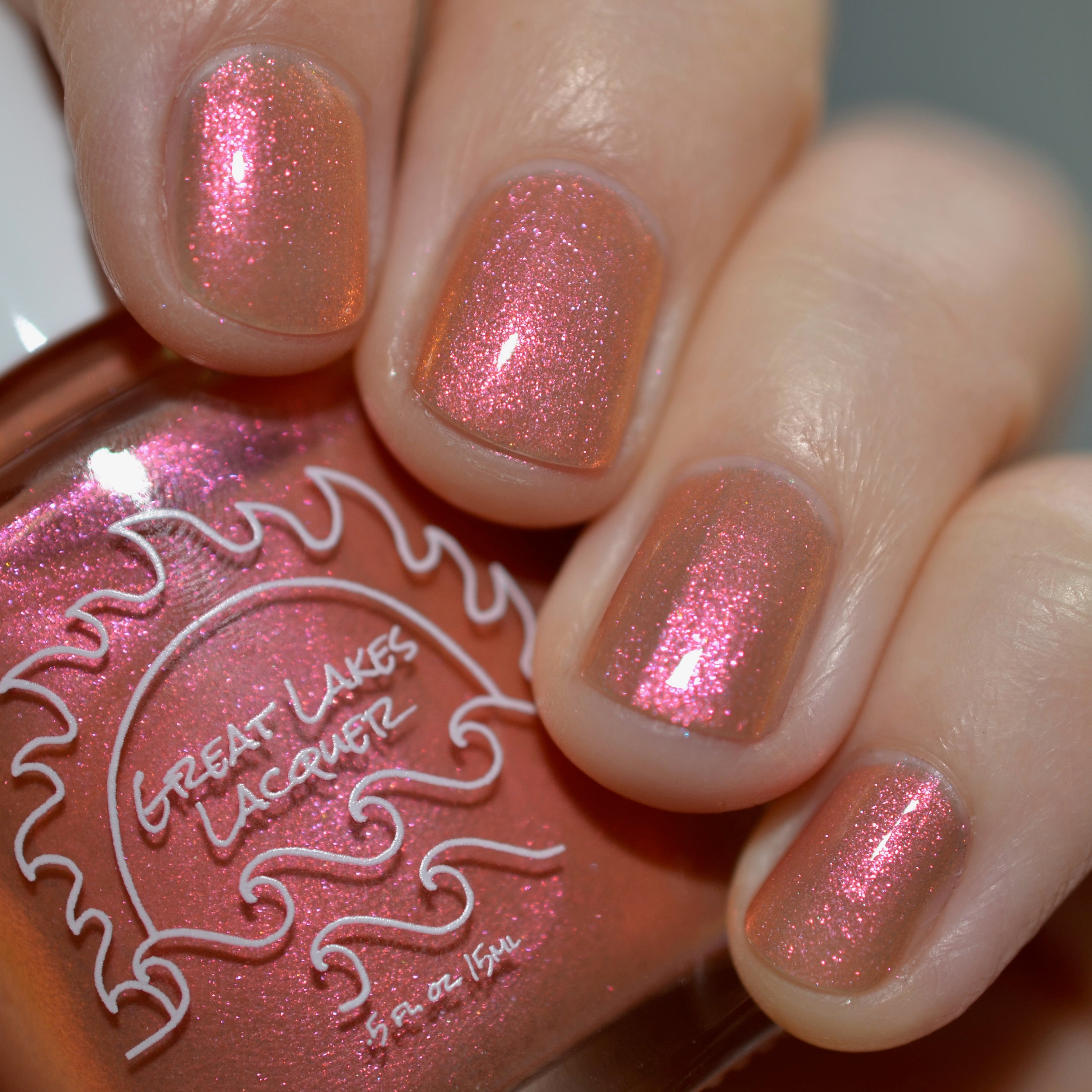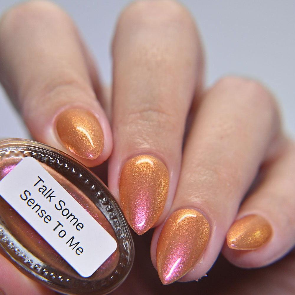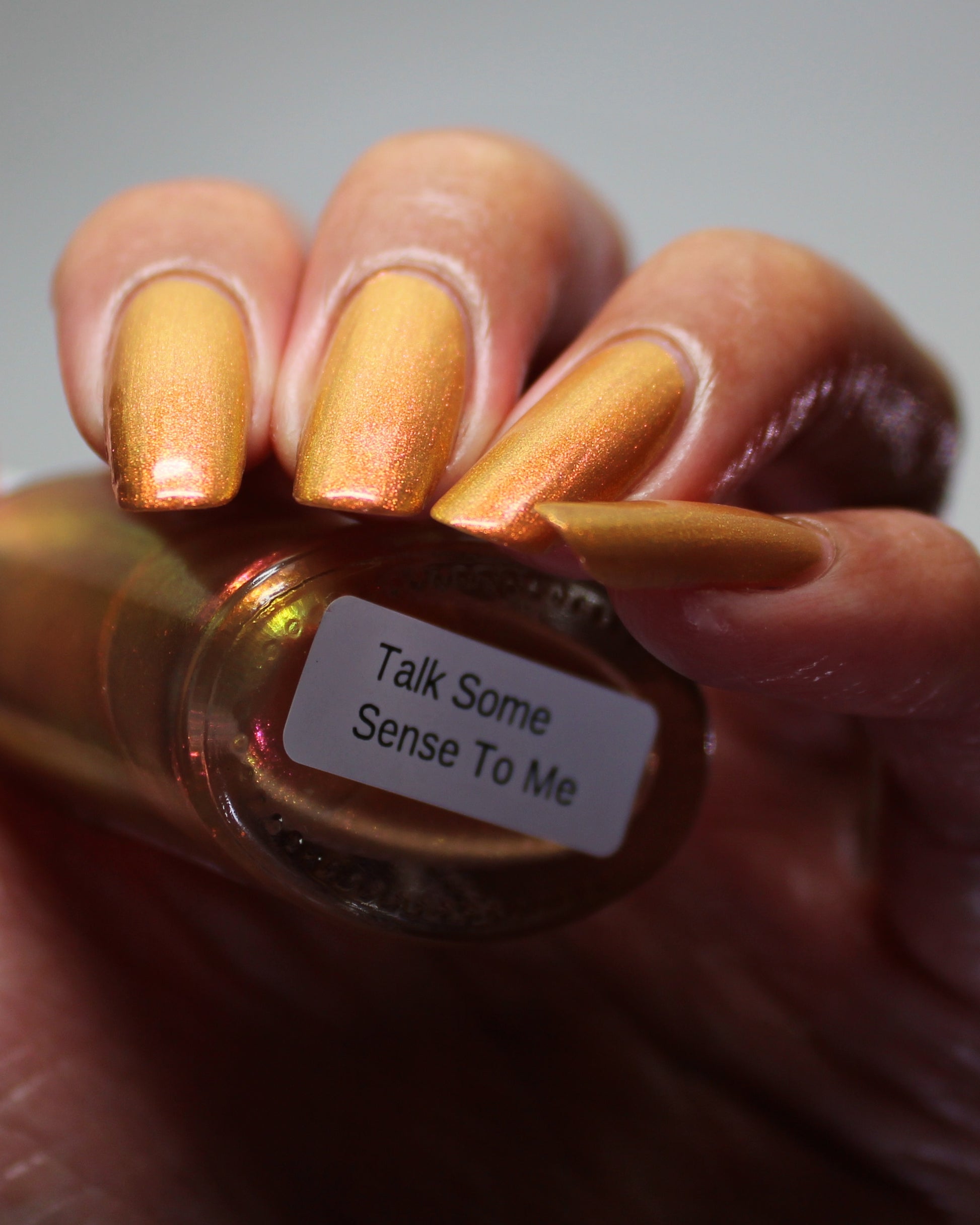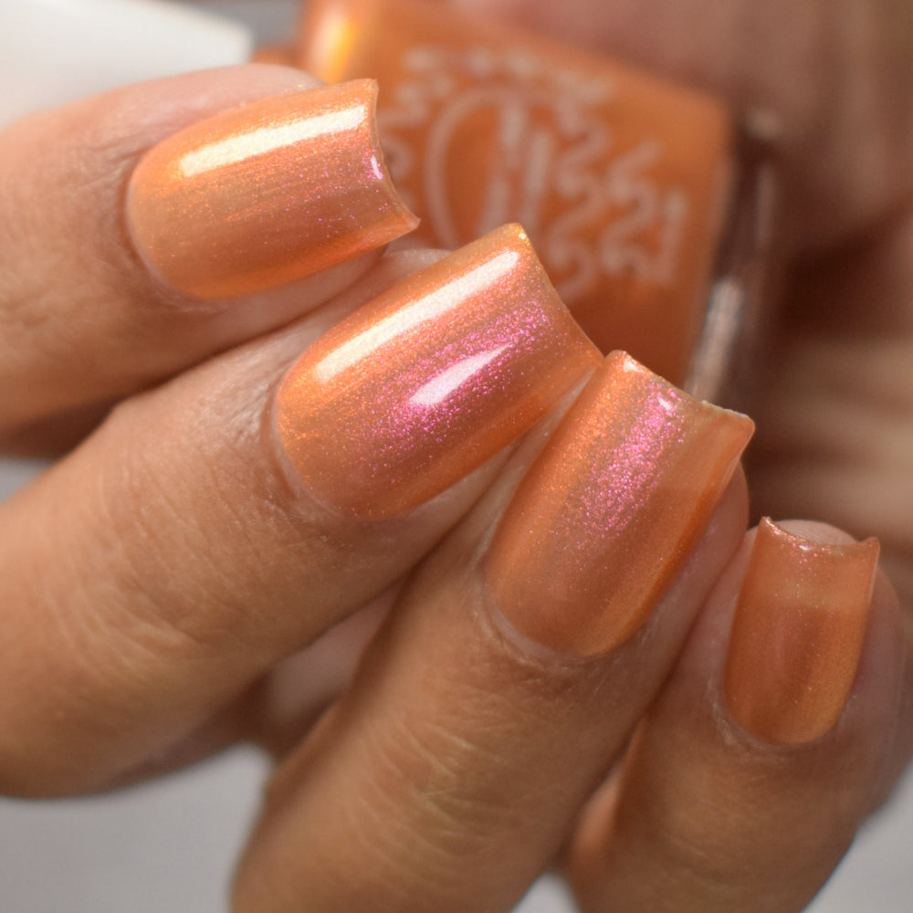 A bronzy sand with a peachy undertone filled with a pink to orange to gold shifting shimmer. This one has a very similar but different base color (more sand than light tan if that matters) and is a bit more opaque.