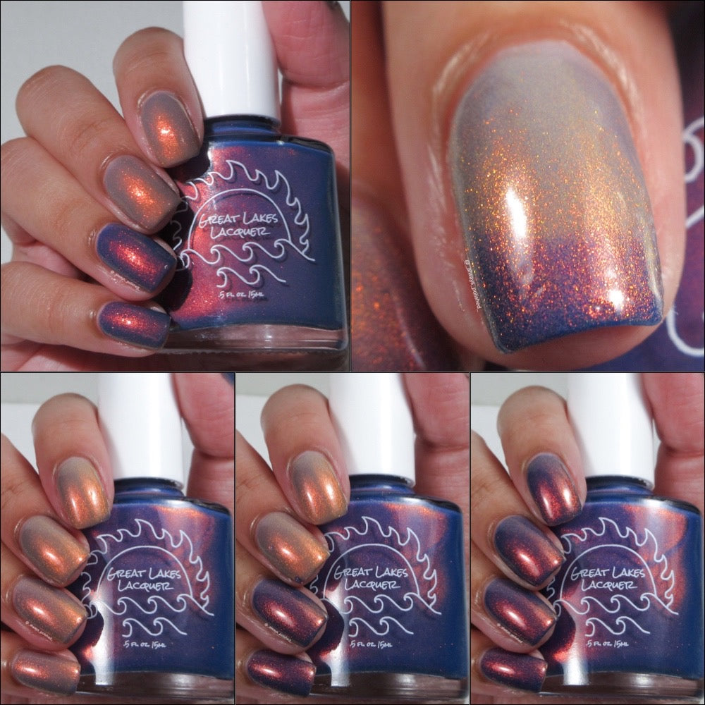 A navy blue (cold) that transitions to a warm light tan (warm) filled with a red to orange to gold shifting shimmer. This is slightly more opaque and a bit darker in tone than that of the OG release.